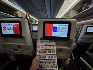 今回は非常口座席です。この機材はJALからJTAへの移籍機のようで、機内で流れる音楽はJTAのものであるものの機内安全ビデオはJALのものでした。