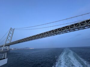 そして大阪南港17:00発新門司港行き名門大洋フェリー1便に乗船!途中、万博の大屋根リングや明石海峡大橋を見つつ九州への船旅です。