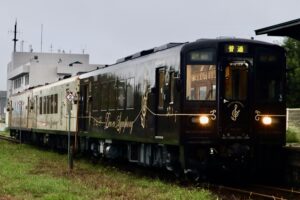 その後、貸切の乗車駅である川内駅に到着し、貸切列車へ乗車!車両はくまモンカラーの黒に赤丸が大きく配置されたくまモンラッピング列車3号でした。