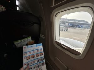 今回は非常口座席です。この機材はJALからJTAへの移籍機のようで、機内で流れる音楽はJTAのものであるものの機内安全ビデオはJALのものでした。