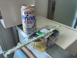 何も買わずに沖縄を去るのも勿体無いのでオリオンビールとジューシーおにぎりを購入しました。