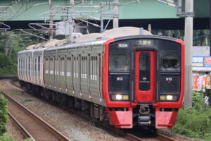 その後、貸切の乗車駅である川内駅に到着し、貸切列車へ乗車!車両はくまモンカラーの黒に赤丸が大きく配置されたくまモンラッピング列車3号でした。